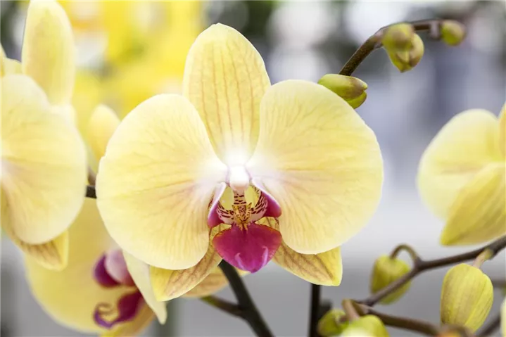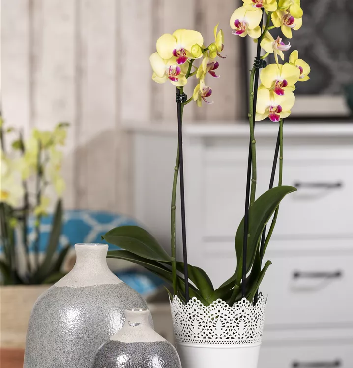 Phalaenopsis, gelb bringt von Januar bis Dezember dekorative gelbe Blüten hervor.