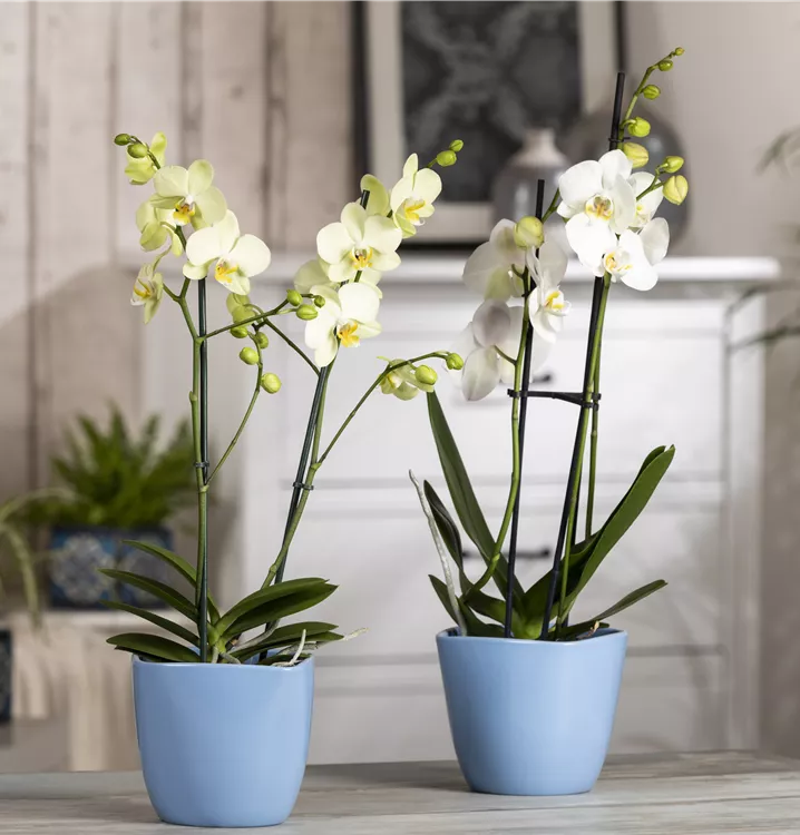 Die Schmetterlingsorchidee (Phalaenopsis) ist eine schöne, in verschiedenen Farben blühende Orchidee. Ihre lippenförmigen Blüten sind sehr dekorativ und erscheinen in Rispen von Januar bis Dezember. Für das optimale Wachstum sorgen ein heller Standort sowie ein spezielles Orchideen-Substrat.