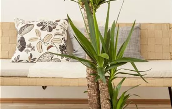 Die Riesen-Palmlilie (Yucca elephantipes) trägt dunkelgrüne, lineale, matte Blätter. Diese aufrechte Pflanze gedeiht am besten an einem sonnigen Standort.